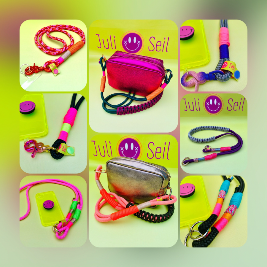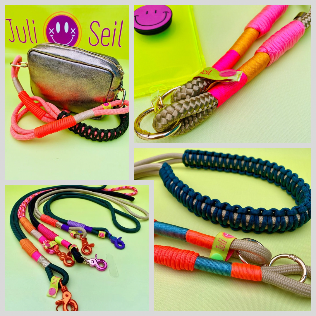 Mit den bunten Handyketten und Taschengurten hast du nicht nur die Hände frei für die wichtigen Dinge, sondern kannst jederzeit deinen Style ändern. Einfach auswechseln und dein Outfit mit einem bunten Juli Seil aufpimpen! Handmade with love aus Paracord & Tauseil 🩷