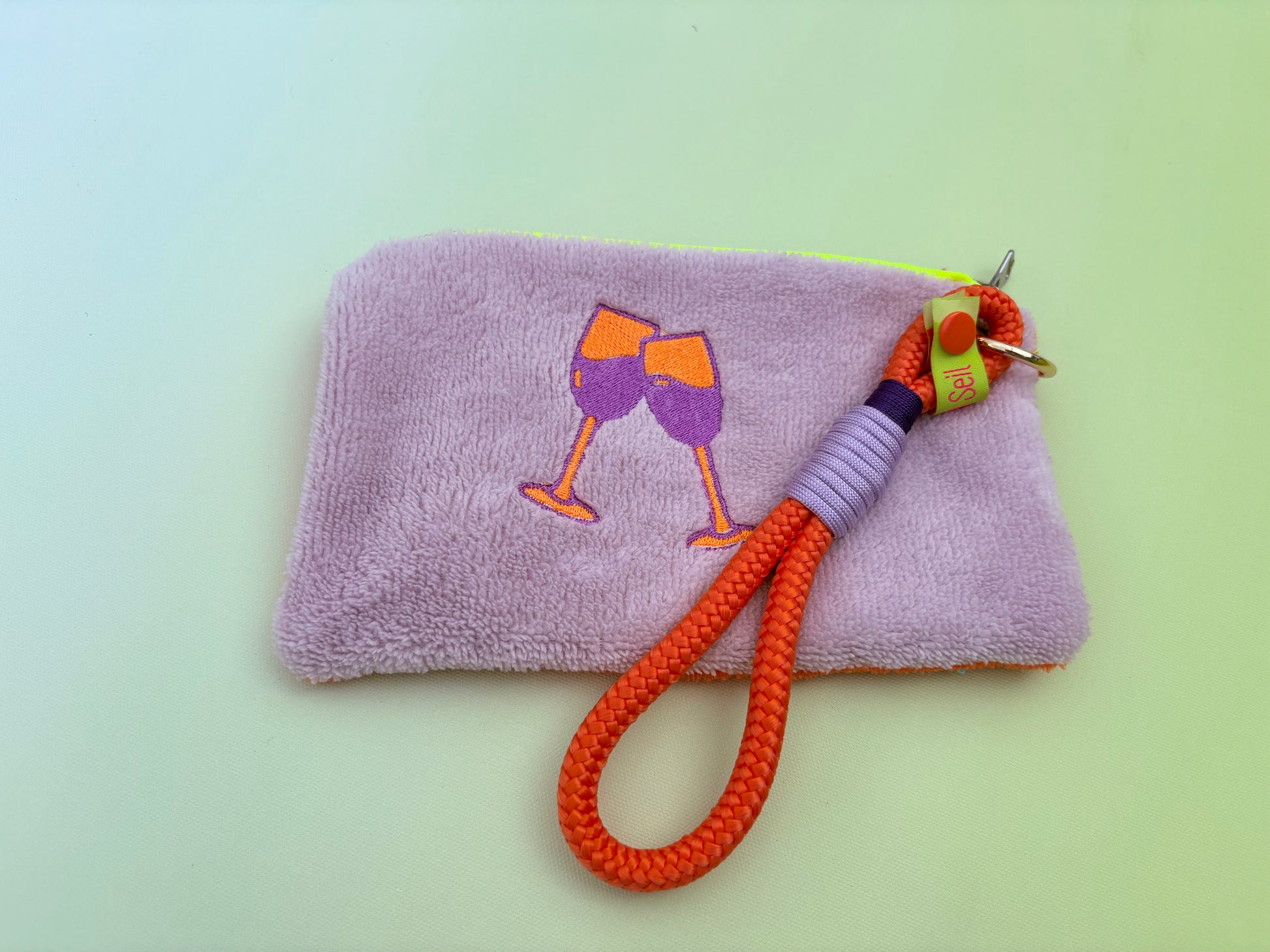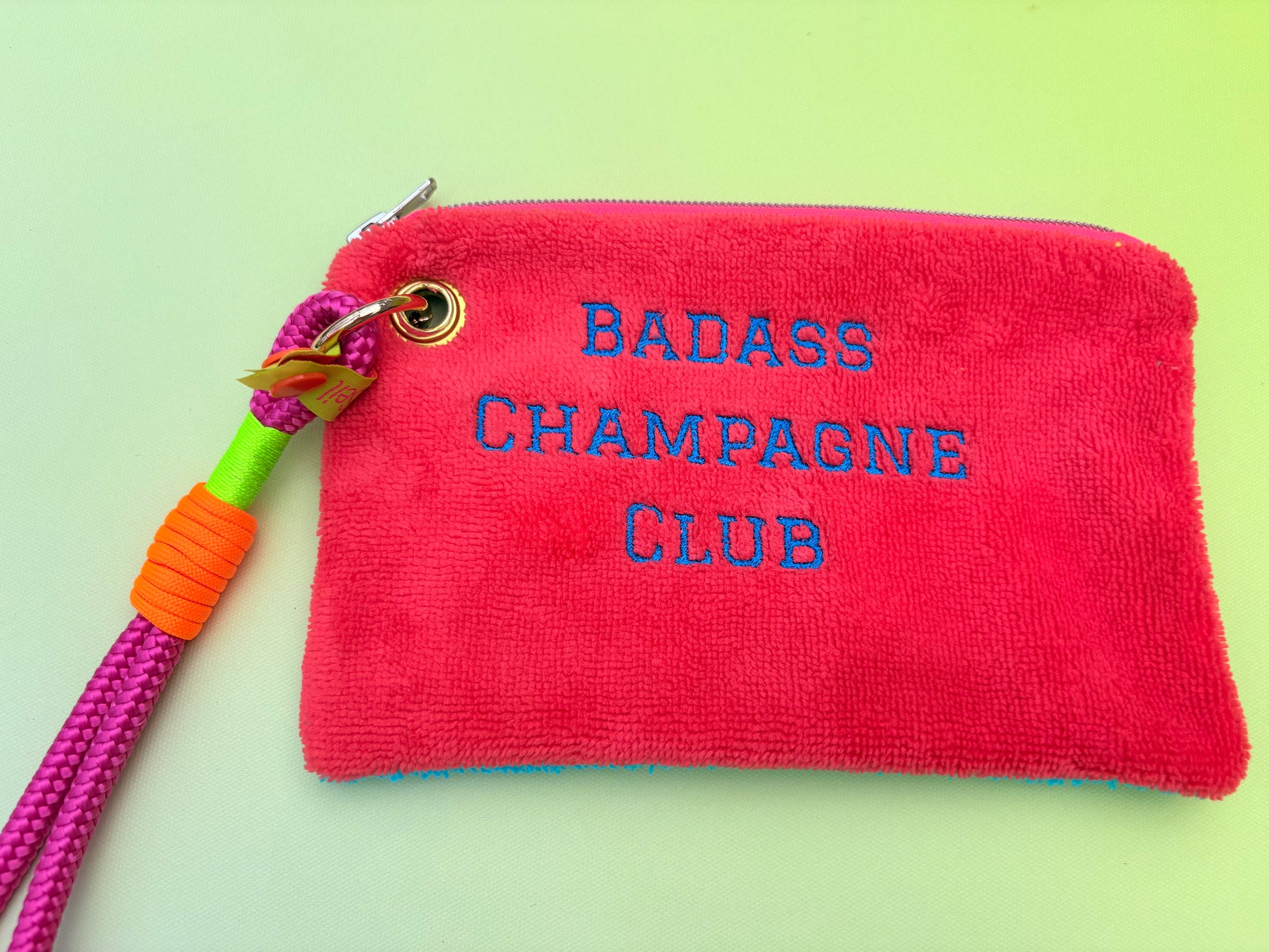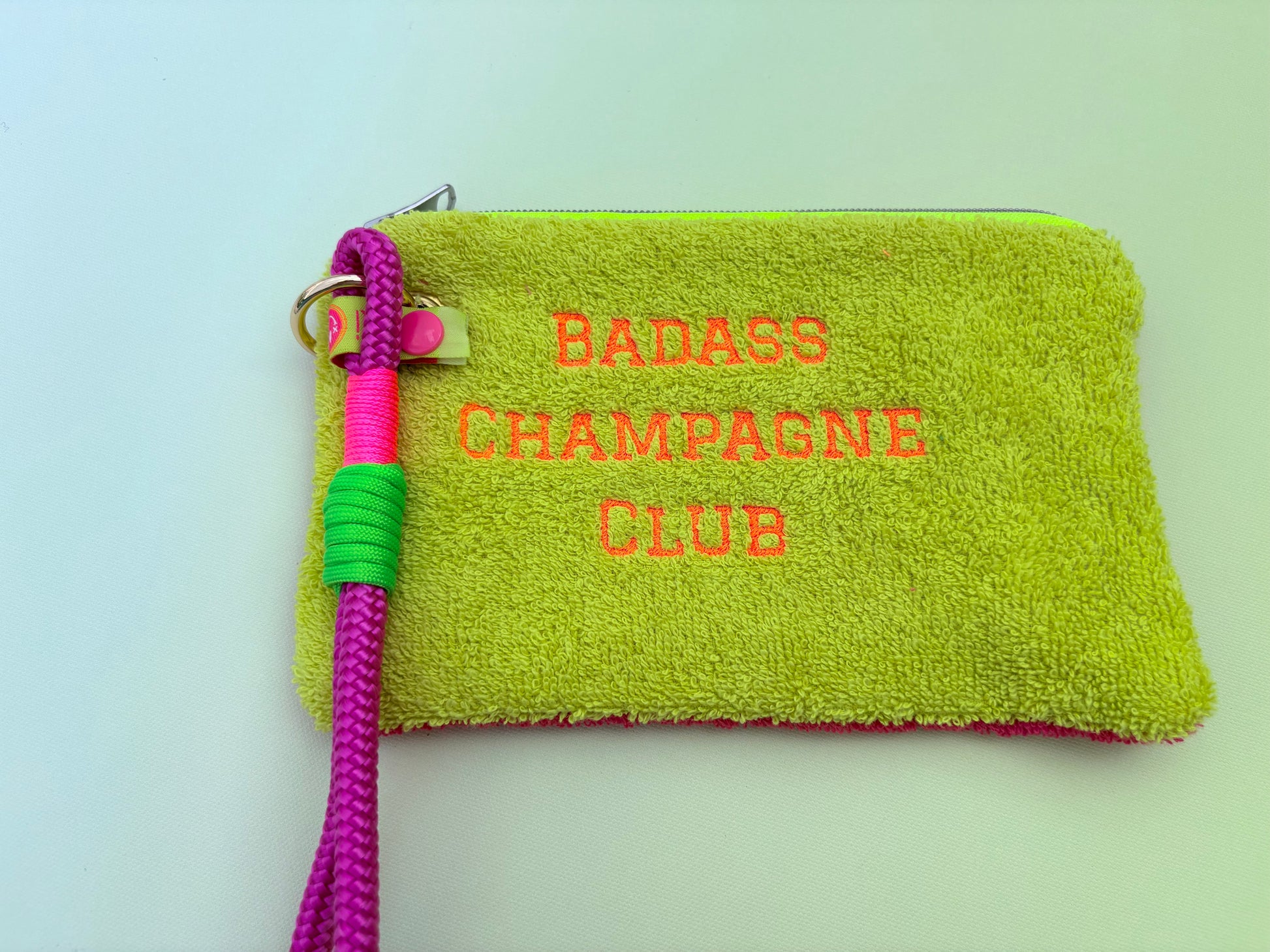 Gute Laune Täschchen „Badass Champagne Club“ aus Kuschelfrottee mit Handschlaufe aus Segeltau