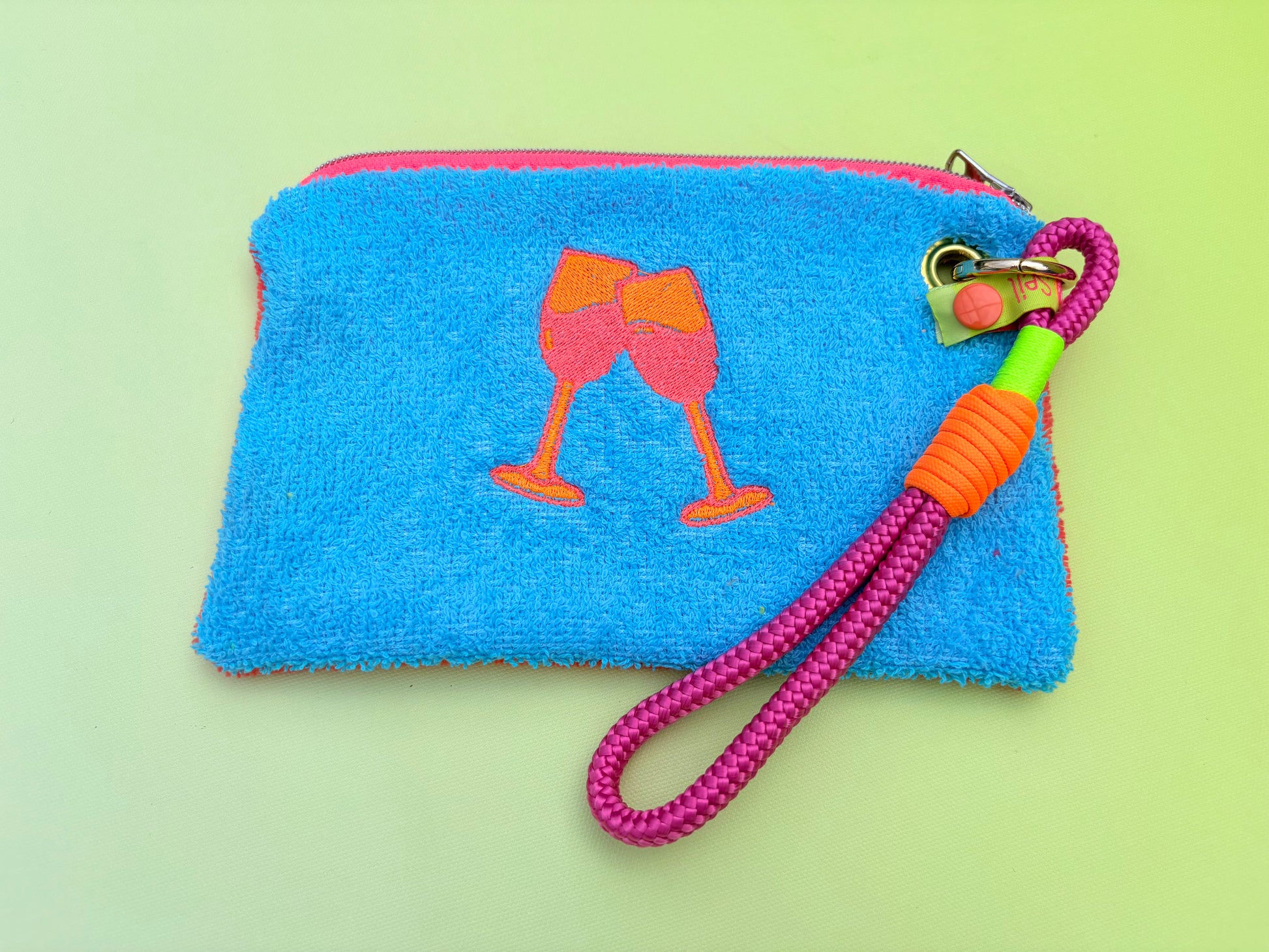 Buntes Kosmetiktäschchen aus weichem Bambusfrottee und Frottee in tollen Farbkombinationen. Bestickt mit Champagner Gläsern auf der Vorderseite und Statement Spruch „Badass Champagne Club“ auf der Rückseite.